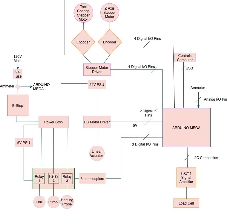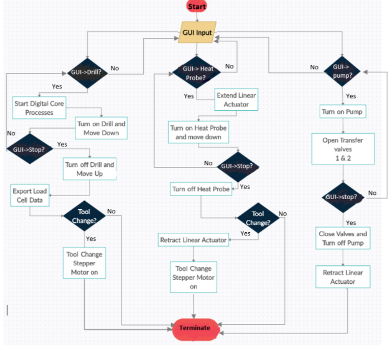 This is the High-Level SW flowchart. It was implemented into Arduino C code through a FSM representation. Each state would be an action the system executes with commands from the GUI being the state change triggers.