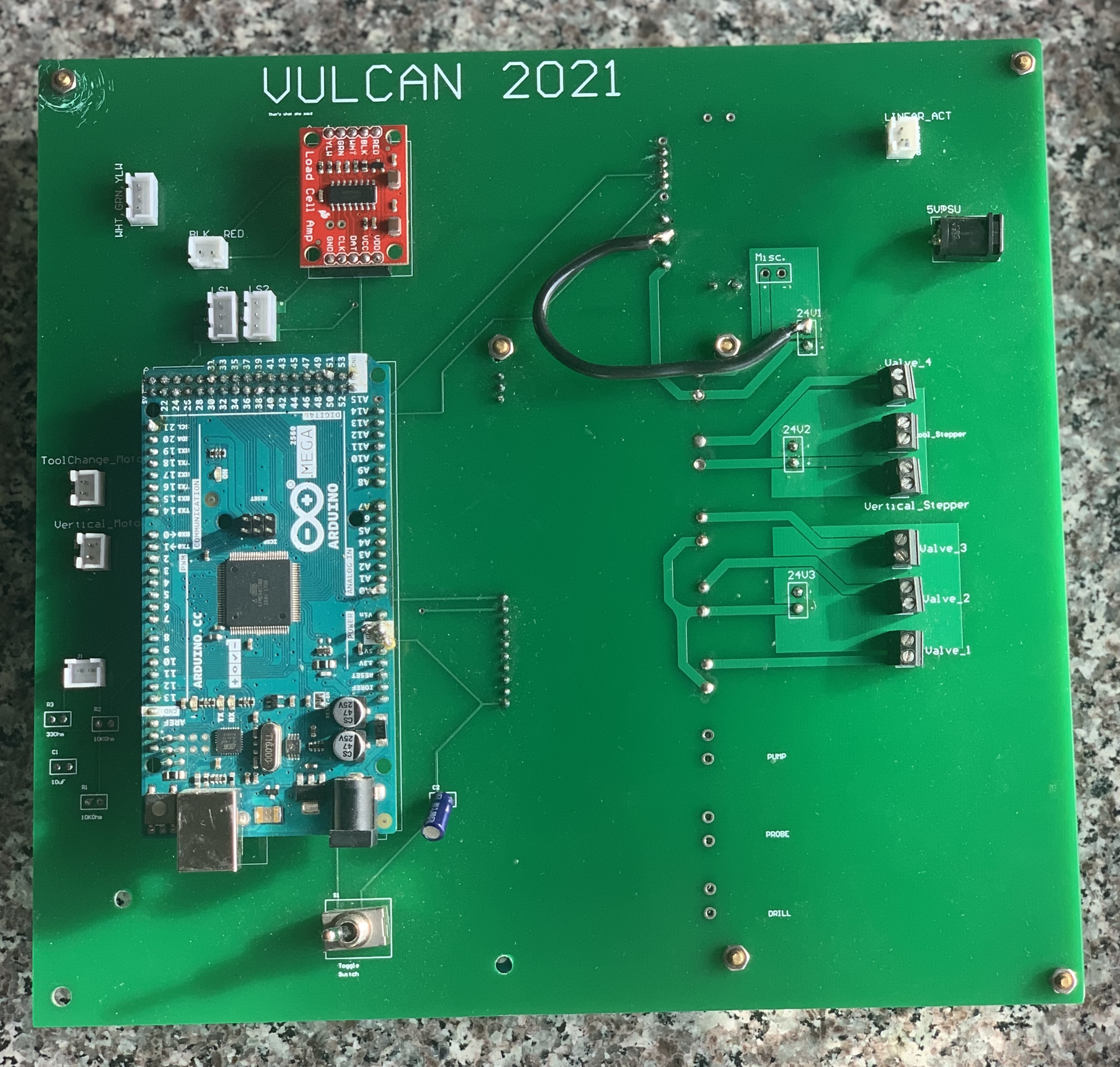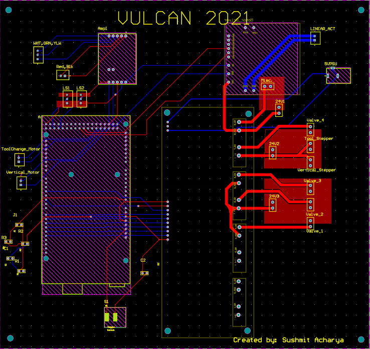 This PCB was made primarily to reduce wiring complexity and allow for quick debugging. In addition to that, it allowed for using only one 24V Power Supply instead of 3 through some power branching analysis. This was crucial in achieving our lightest Mass Award as it removed ~4